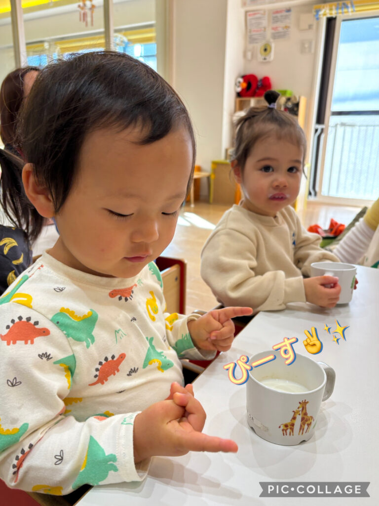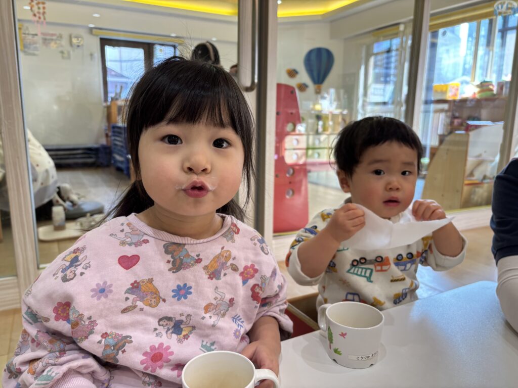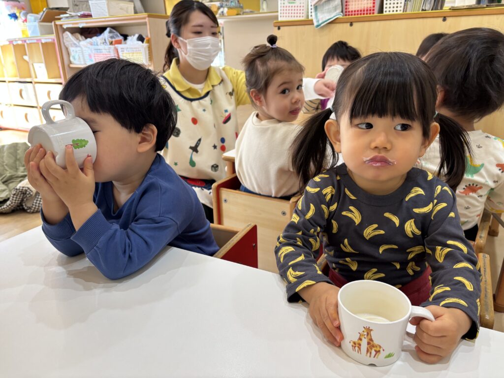 さんぽ前の子どもたちは皆んなで牛乳やお茶を飲みます😀✨
