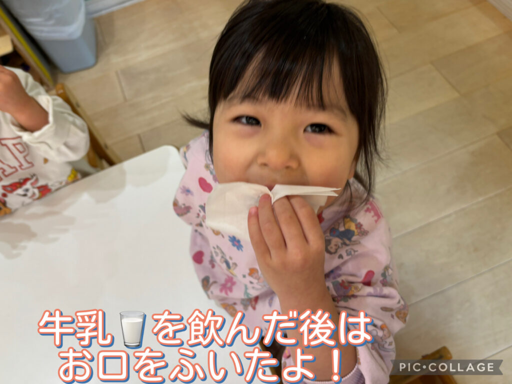 コップをしっかり持ってごくごく飲んだ後は、自分でお口まわりをキレイにふくことができていました!✨👏