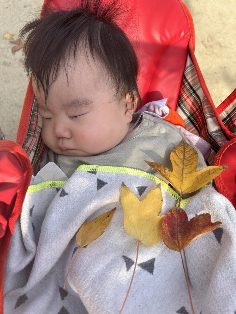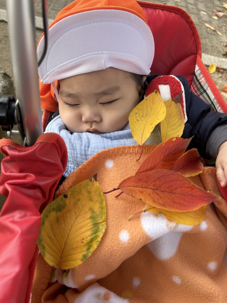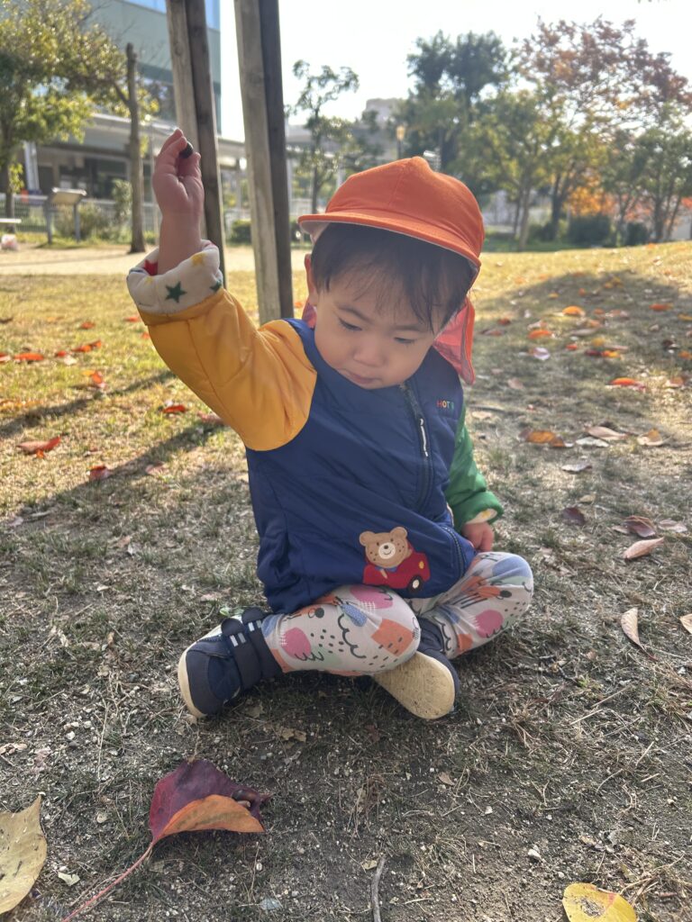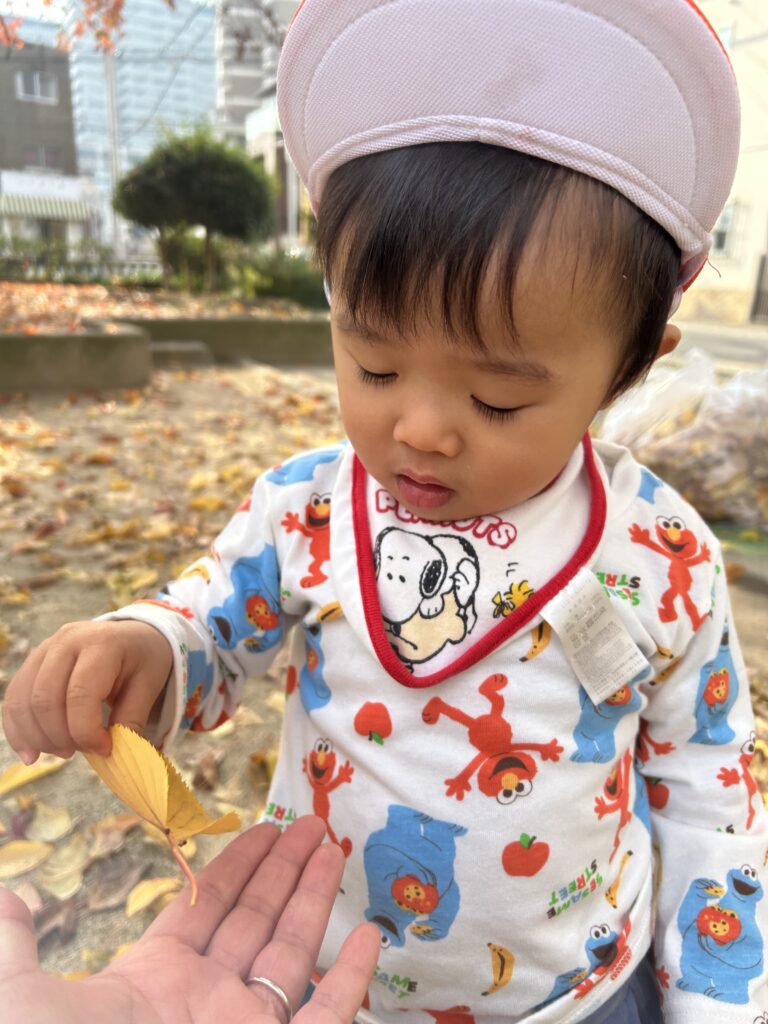 こんにちは‼︎ 保育士の髙石です😊 暖かい日が続いていますね☀️ 0歳児クラスは心地良く秋🌰探しのお散歩に行ってきました🎶 公園にはいろいろな形・大きさの落ち葉がありました🍂