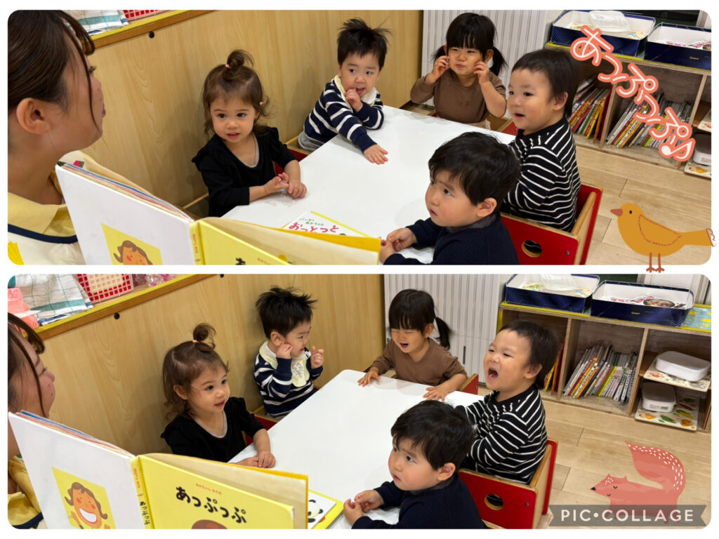 先生が絵本📕を読むのに合わせて「あっぷっぷ」をしてみたり♪