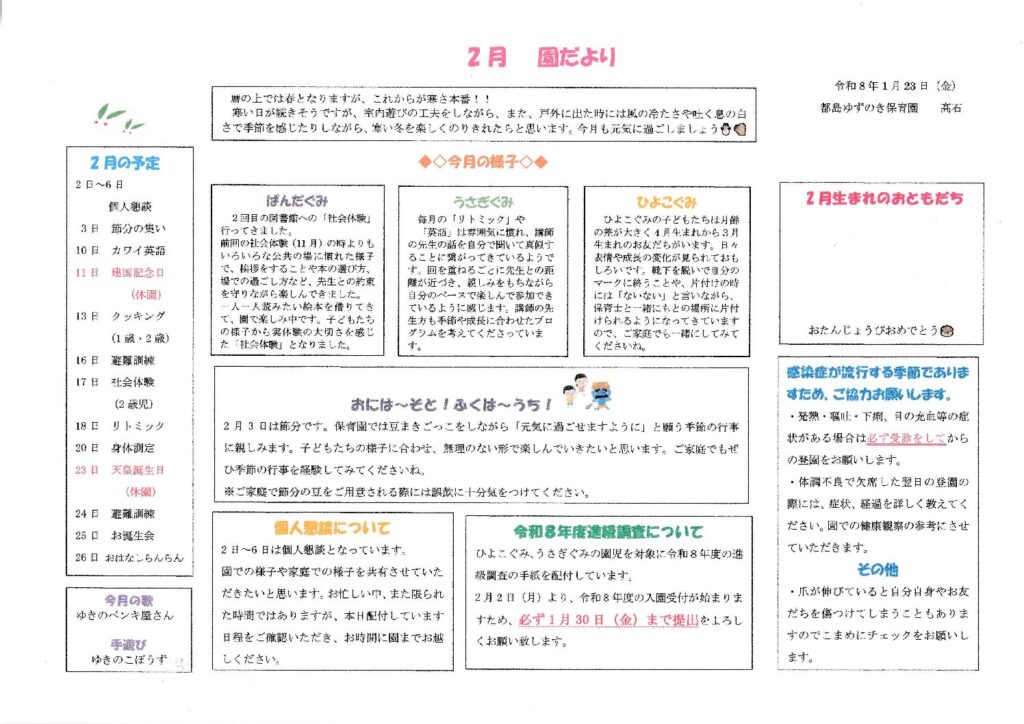 都島ゆずのき保育園の2月園だよりをUPします❕